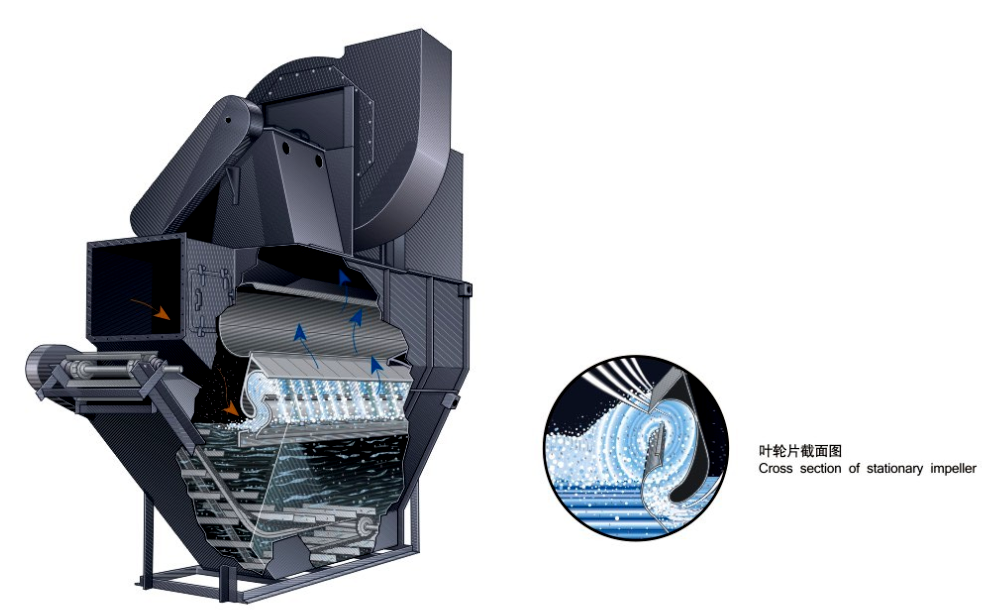 RCN濕式除塵器,利用高壓風機引流水花造浪,鼓浪洗滌粉塵,不用濾料,不用水泵,不用噴頭,污泥通過拉鏈機刮泥裝置排出。