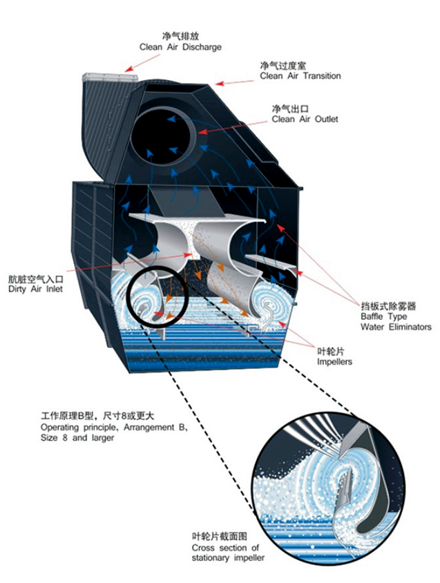 (2)靈活性:如需要調(diào)整收塵效率,可通過調(diào)整水位,同時相應調(diào)整排氣風機的規(guī)格,就可以使收塵效率增加或者降低。精心設計的葉輪片可產(chǎn)生較高的壓降和較高的氣流速度來增加收塵效率。