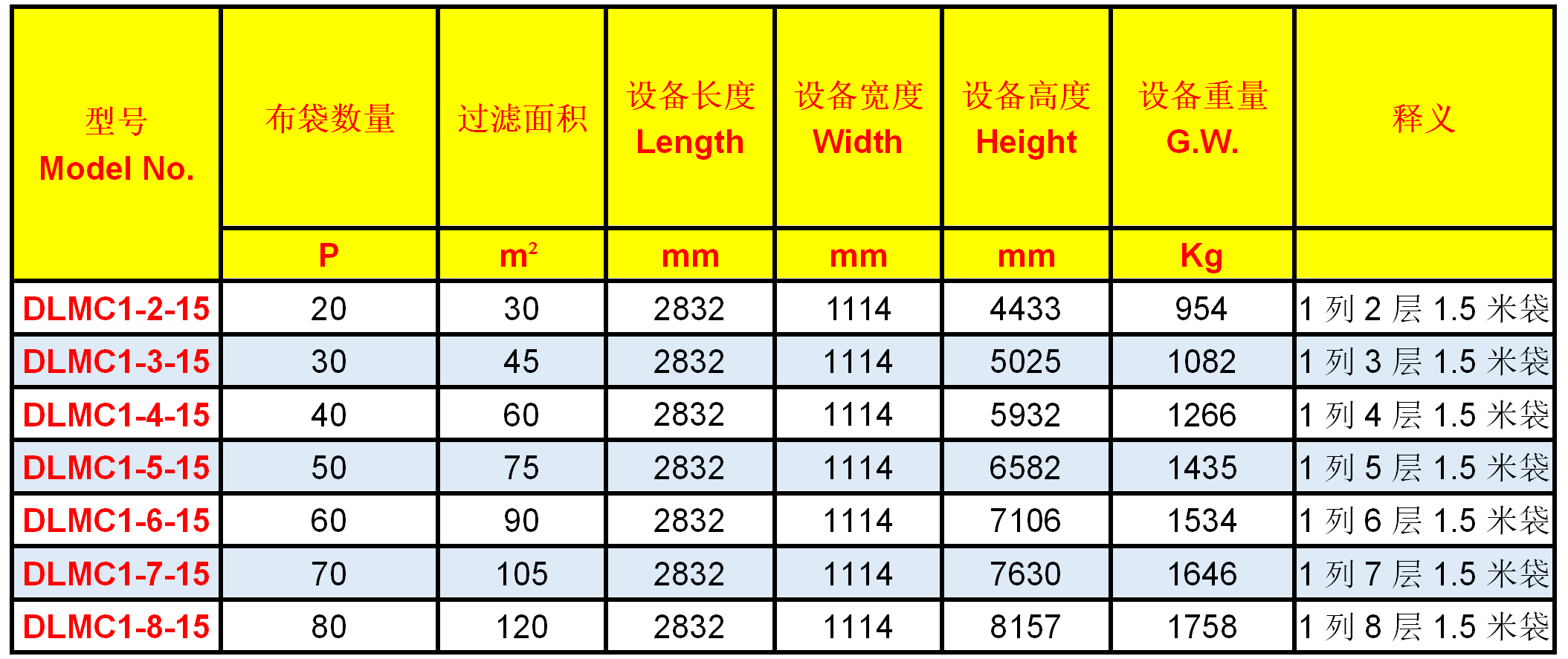 8、以DLMC4-8-15為例,表示4個(gè)8層的模塊,采用1.5米濾袋,總共320袋。體積為2832*4114*8157MM。