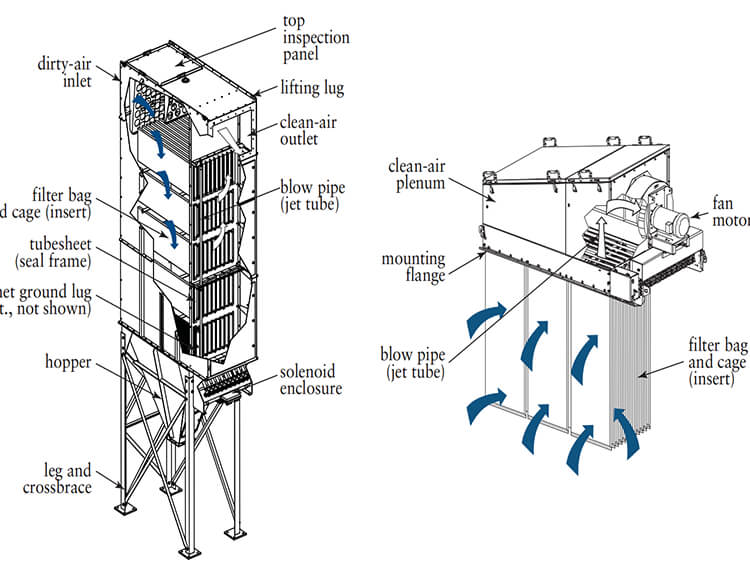 扁布袋除塵器分為DLMC模塊型與DLMV一體機(jī)型(倉(cāng)頂)
