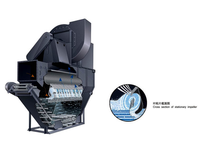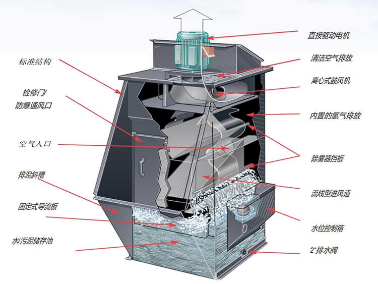 在風機風動力的作用下,高速氣流在狹窄通道內(nèi)呈S形軌跡運動的沖激力,強化粉塵在水洗作用下的濕潤、凝并和沉降功能。含塵氣體由入口進入除塵器,氣流轉(zhuǎn)彎向向沖擊水面,部分較大的塵粒落入水中。當含塵氣體以18-35米/秒的速度通過上、下葉片間的“S”形通道時,激起大量的水花,使水氣充分接觸,絕大部分微細的塵?;烊胨?,使含塵氣體得以充分凈化,經(jīng)由“S”形通道后,由于離心力的作用,獲得塵粒的水又返回漏斗。凈化后的氣體由分霧室擋水板除掉水滴后經(jīng)凈氣出口和通風機排出除塵機組,泥漿則由漏斗的排漿閥連續(xù)或定期的排出。新水則有供水管路補充。機組內(nèi)的水位由溢流箱控制。當水位高出溢流箱的溢流堰時,水便流進水封并由溢流管排出。設在溢流箱蓋上的水位自動控制裝置能保證水面在3-10毫米的范圍內(nèi)變動,從而保證機組穩(wěn)定的高效率和節(jié)約用水。溢流箱上部用通氣管與凈氣分霧室連通,使兩者具有相同高度的水面。溢流箱的水是通過插入除塵器下部的連通管連通的,以保持溢流箱水面平穩(wěn)。