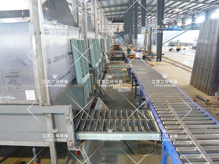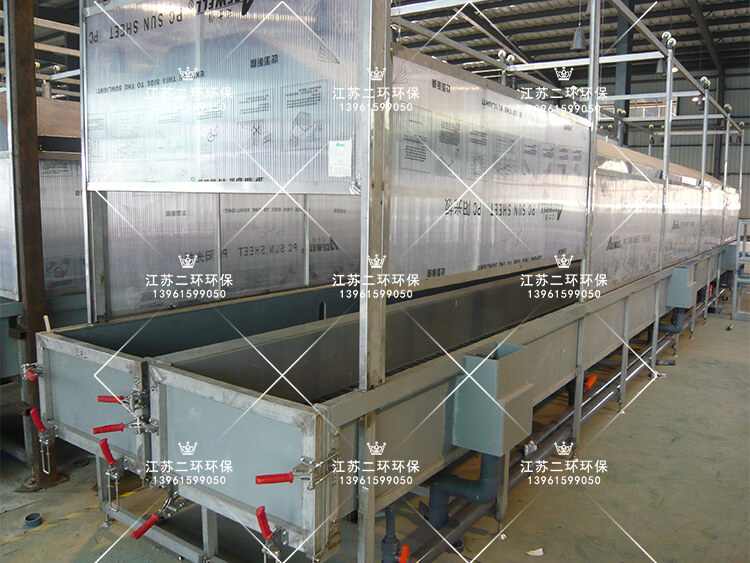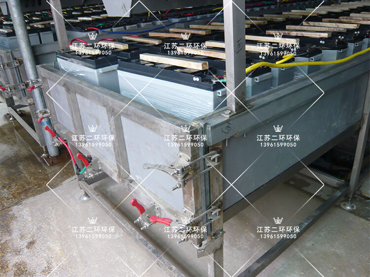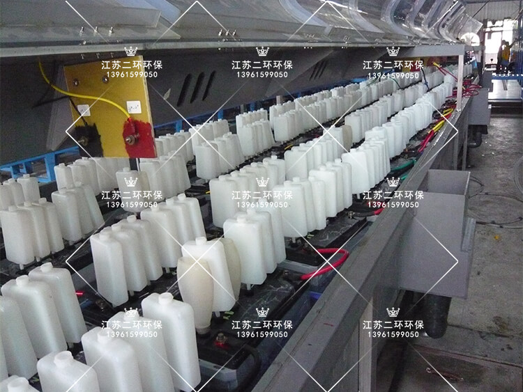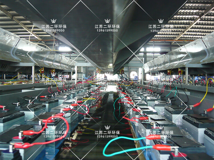 電池化成線,又稱為電池外內(nèi)化成酸霧回收裝置。電池內(nèi)化成充電過(guò)程中,加酸通電發(fā)生化學(xué)反應(yīng),生成鉛氧化物活性物質(zhì)。整個(gè)系統(tǒng)有酸槽、酸霧吸罩,酸霧風(fēng)管、酸霧凈化塔構(gòu)成。類似酸洗槽、磷化槽、電解槽裝置。