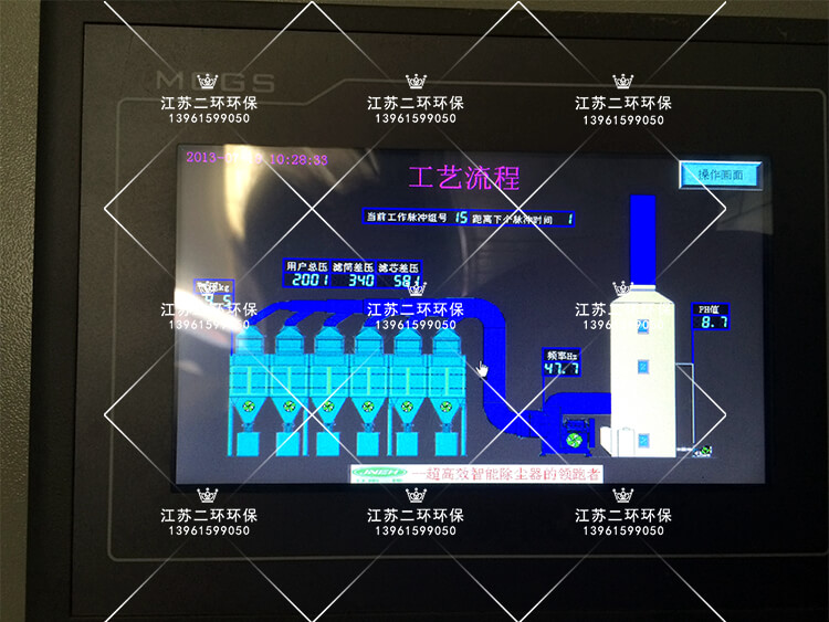除塵器加裝了相關(guān)檢測的儀器儀表、通過PLC程序控制自動運(yùn)行,通過觸目屏展示。